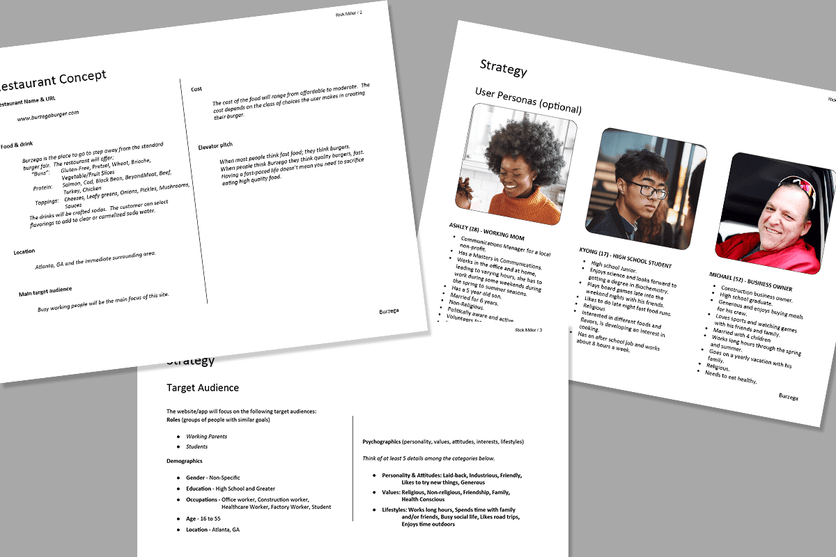Even though this was an imaginary company, I created a client information sheet and envisioned hypothetical users'. In reality, I would want to investigate this same information in a client's company and its target users. Next, I engaged in secondary research on best practices in restaurant website design. I also did a competitive audit between two successful restaurant websites. This design also required me to create a moodboard to guide the design outcome.