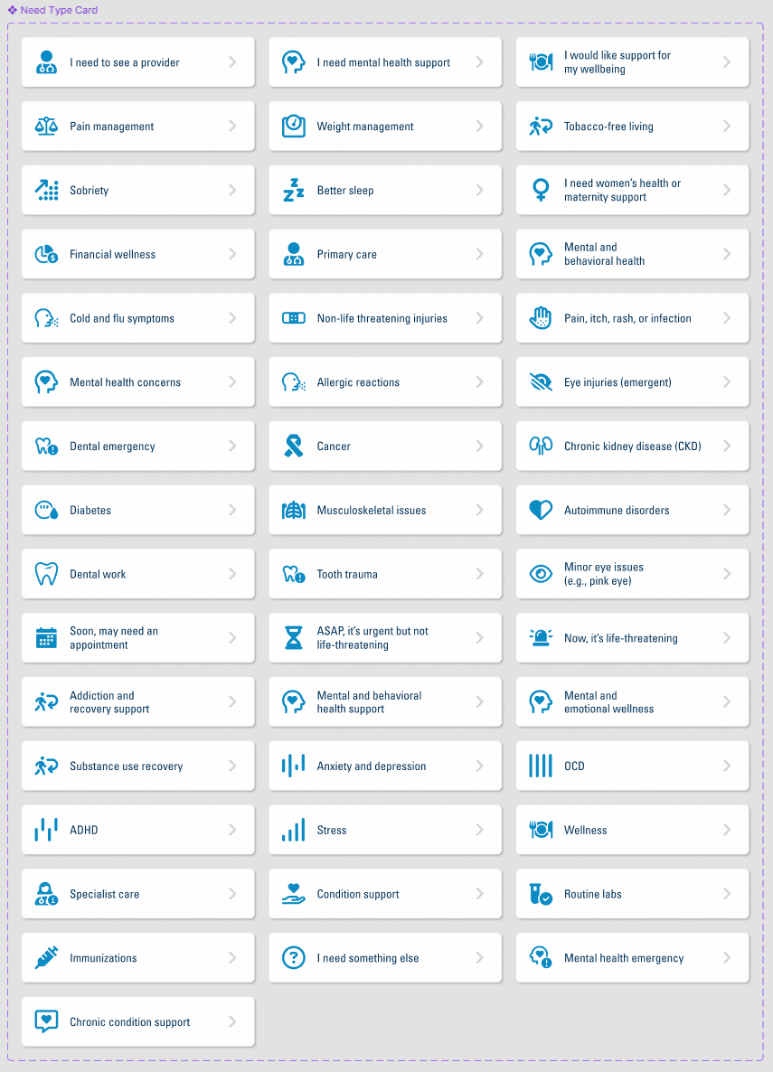 I designed the entire CarePath UI, but will not completely show it due to my ethical obligations to BCBSSC. The part I will focus on is the creation of icons for every card in the app. Most of them were sourced from fontawesome.com, but I also created icons. Several of the need types were challenging concepts to convey with stock icons. I focused on visually translating those concepts and medical conditions.
