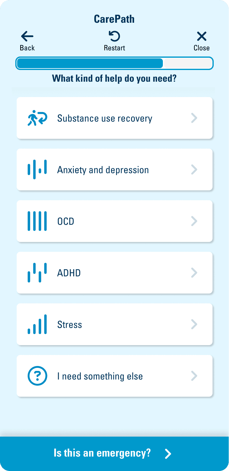 CarePath is a part of the MyHealth Toolkit app that is owned by BlueCross BlueShield of South Carolina (BCBSSC). The purpose of CarePath is to help members get connected with all the services and benefits that are part of their policy. Throughout the user flow members are prompted with questions that help to funnel them to different categories of care.