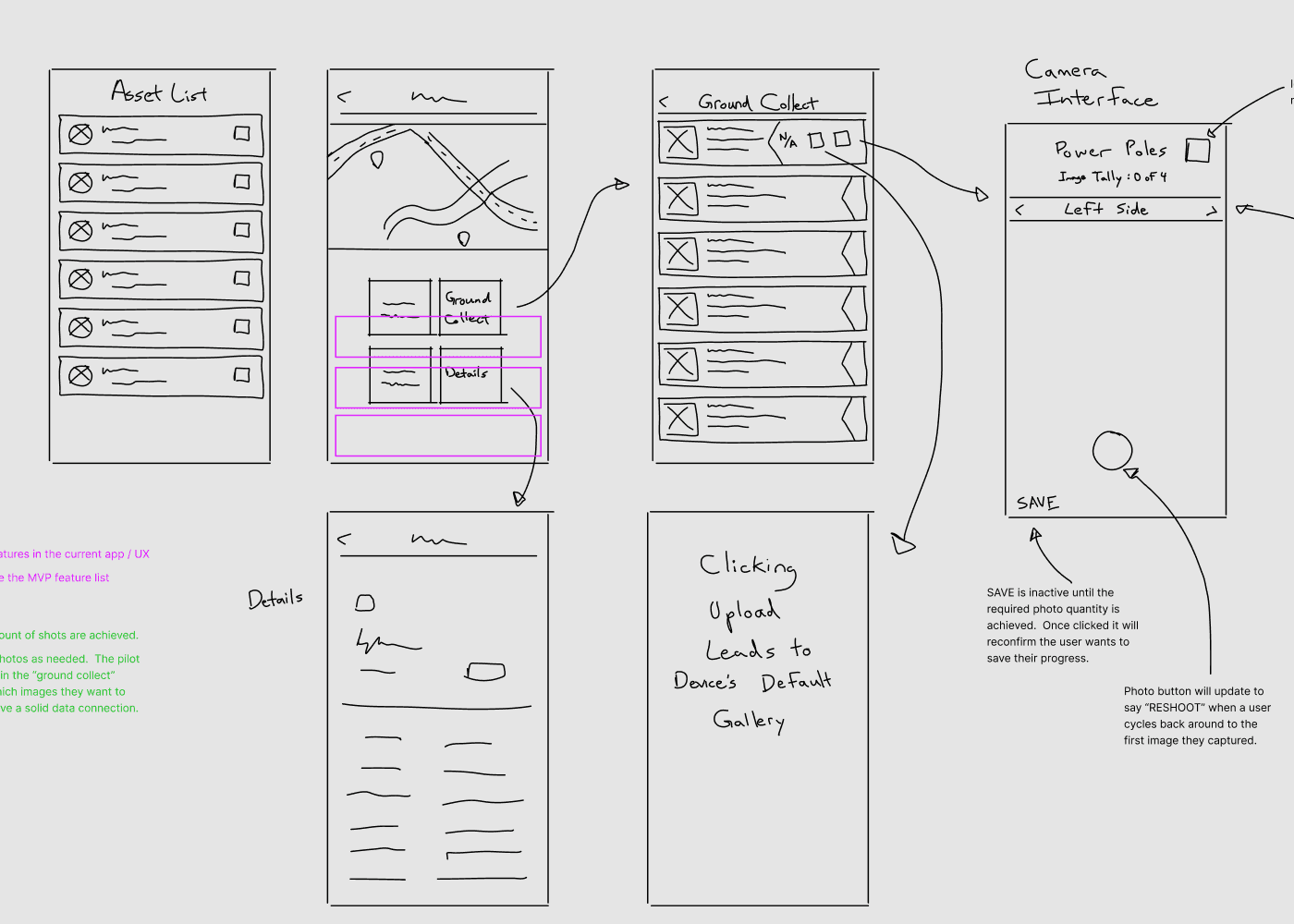 I met with my senior colleagues and explained what I was thinking. We discussed whether to move on to digital wireframes. My colleagues suggested we move on to high-fidelity designs so we could quickly cast our design vision to the client. I was responsible for designing the initial ideas for the Job Listing, Asset Details, and Ground Collect workflows.