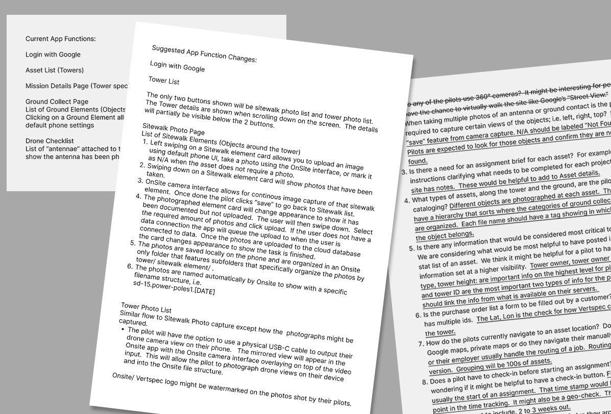 This client captures site information and tower data for telecommunications sites. They came to us to create a well-rounded solution to aid their drone pilots on job sites. Their product goals were: